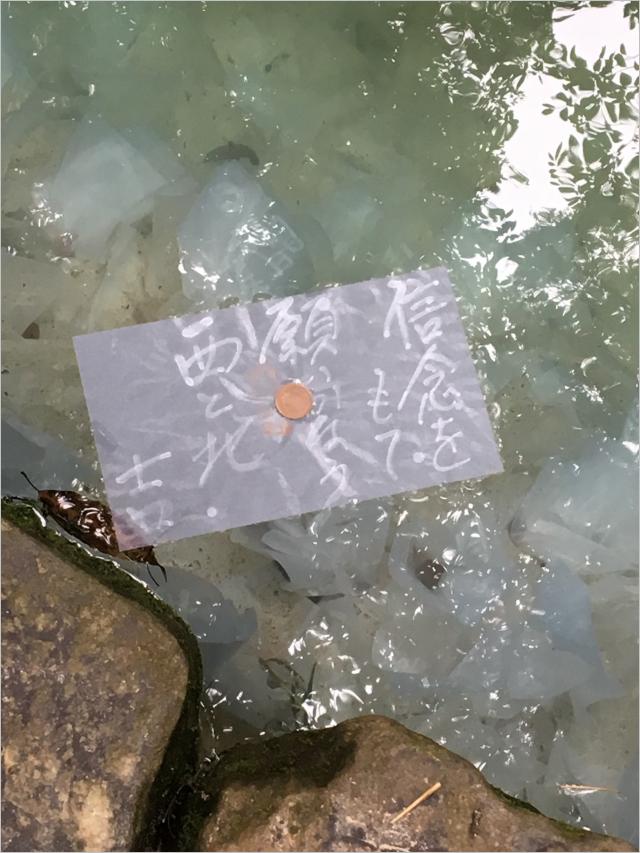 この池は占いの池で、半紙の上に硬貨を置いて池に浮かべると言う変わった占いです。